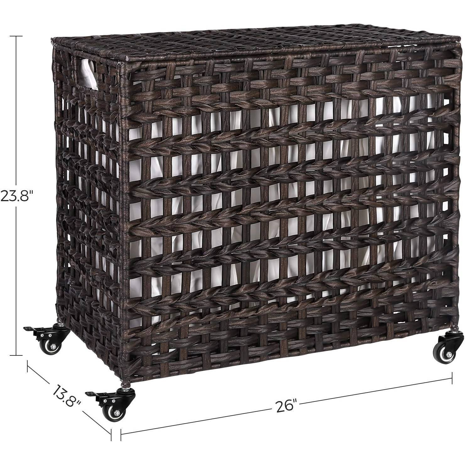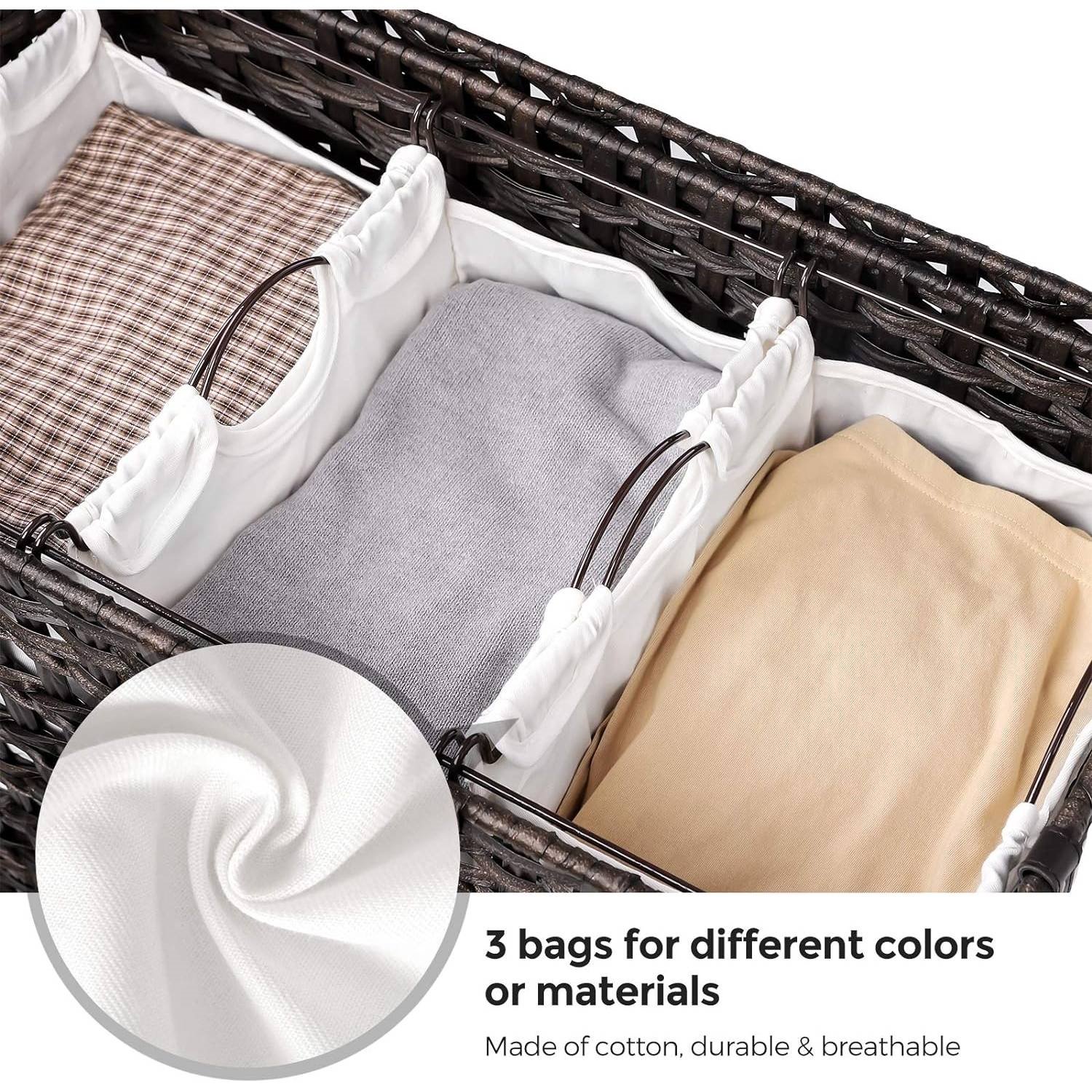 • Brown PP Rattan 3-Basket Laundry Hamper Sorter Cart with Removable Cotton Bags