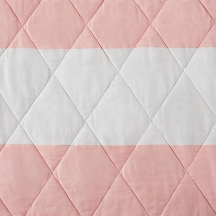 This Full/Queen 3 Piece Pink Rainbows Reversible Cotton Quilt Set adds a bright, playful accent to any bedroom with its colorful two-tone pink/white stripe pattern on one side and a bold print on the reverse. It includes a quilt with a noticeable diamond weave along with two coordinating shams.. Each item is made from a breathable cotton fabric that arrives pre-shrunk and is good for all seasons. This set is non-pilling, so it stands up to frequent use and multiple trips through the washing machine.