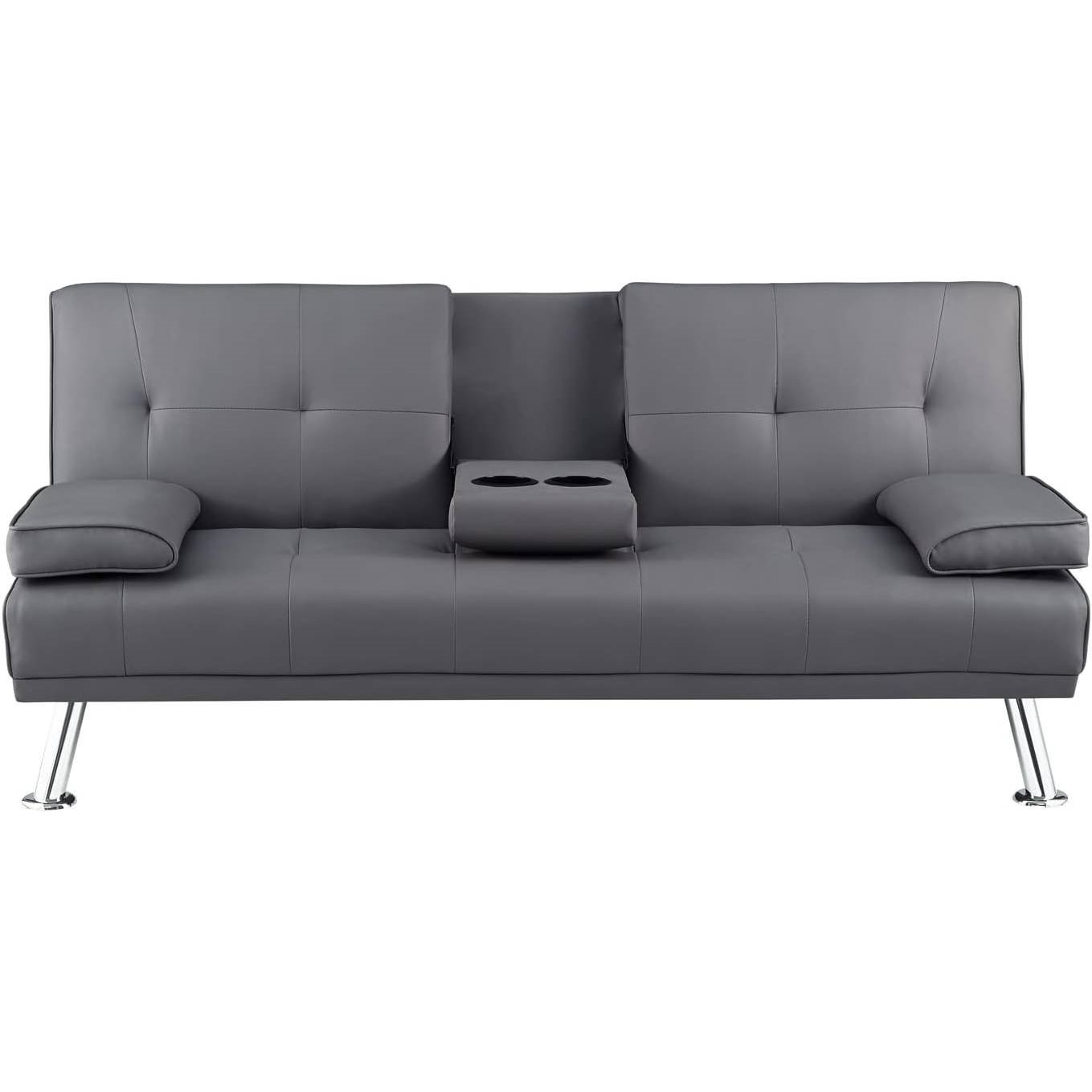 • Modern Futon Sleep Sofa Bed Couch in Grey Faux Leather with Cup Holder