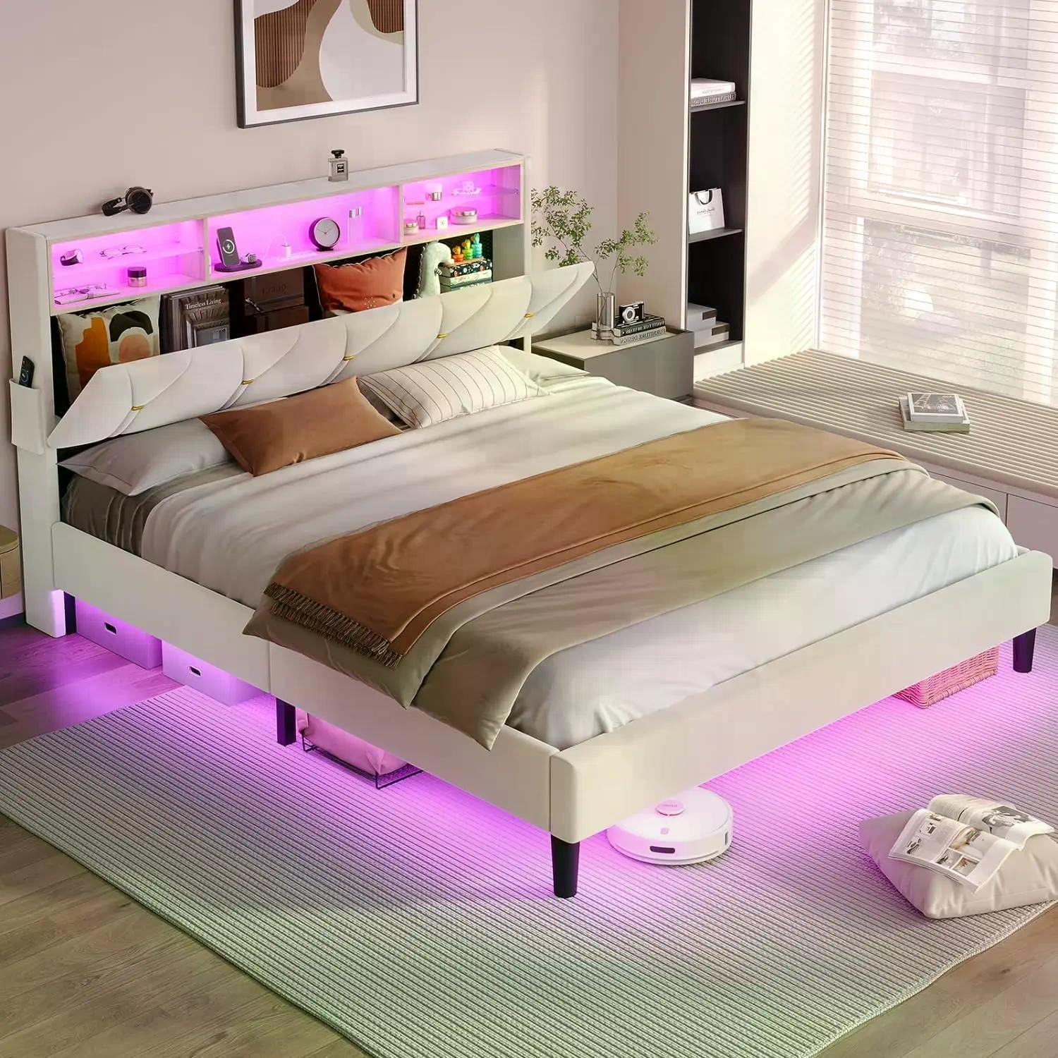 [LED Lights on the Headboard and under the Bed]The queen bed frame has RGB light strips attached to the headboard and under the bed, and the LED lights can be controlled by a mobile app or a remote control. You can freely set the brightness and color (more than 60,000 colors to choose from), and there are control modes such as style mode, music mode, microphone mode, and timing function waiting for you to explore. Let you design a unique light show according to your own preferences.