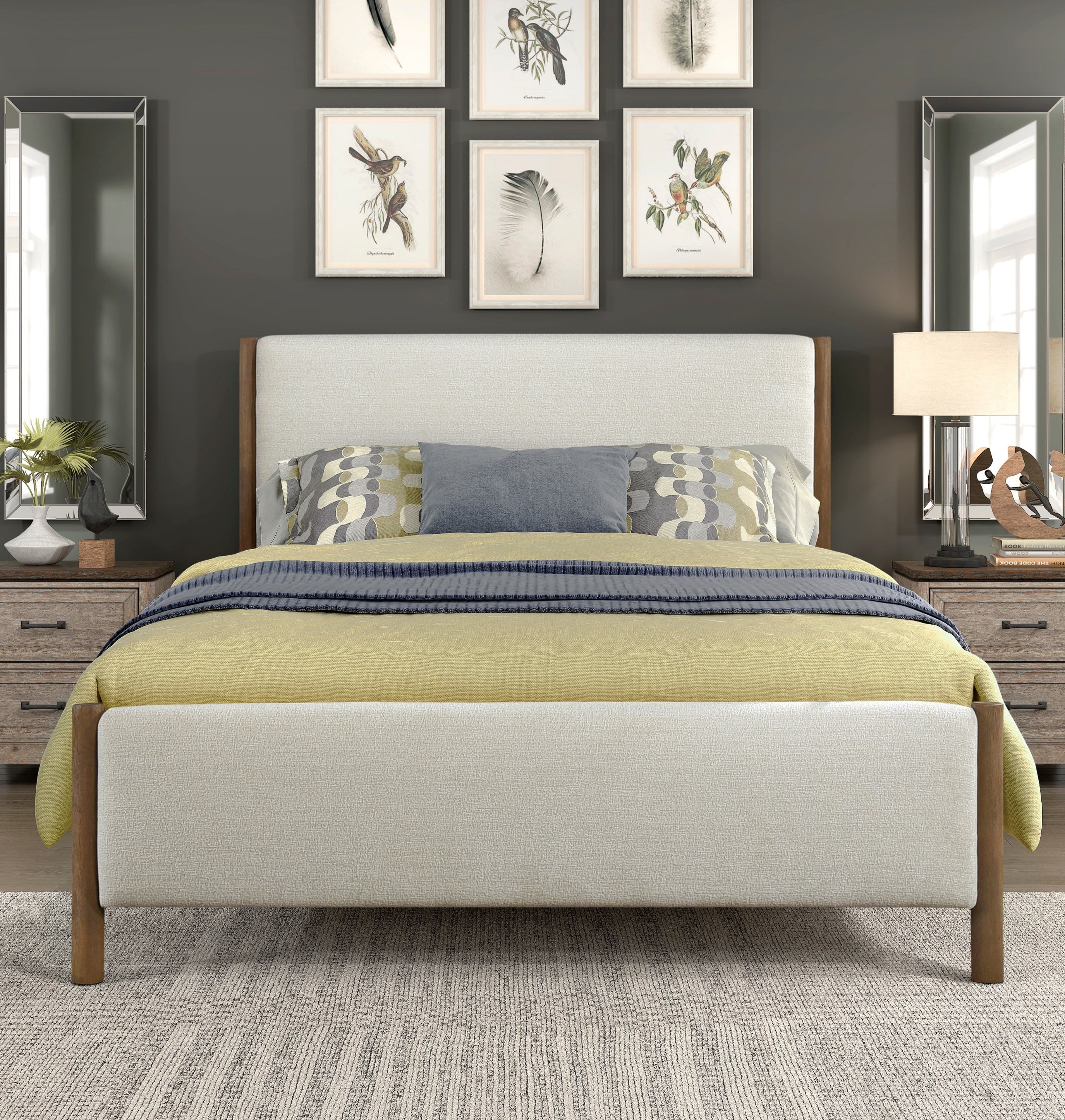 The subtle modern design that defines the Julian Collection utilizes color and texture to create a stylish bed option for your bedroom. The soft beige chenille fabric upholstery that covers the full headboard, footboard and rails is contrasted by the oak finished wood pilasters of the bed's four corners. The platform slat configuration allows for the use of a mattress only, eliminating the need for foundation support.PRODUCT DIMENSIONS: Overall Dimension: 59.5" x 80.5" x 52"HHeadboard width: 59"Headboard height: 52"Headboard width: 59"Footboard height: 20"Rail to floor: 6"Listing Includes: One Full Size Bed Only.Mattress: Not included.Simple Assembly Require.