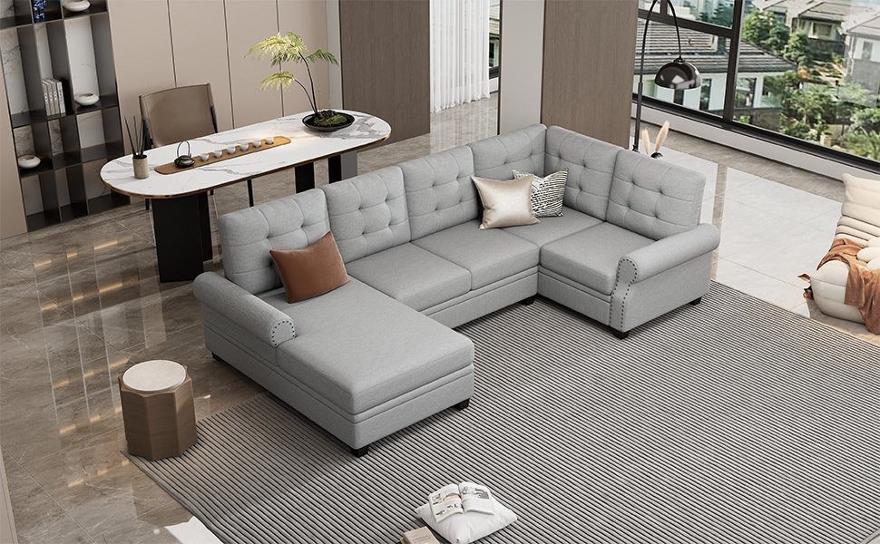 Spacious Couch Set - Designed in modern U-SHAPED for essential space saving and functionality, capable of fitting into cornered walls and providing extended seating space. The U-shaped sectional Sofa has enough seats to sit 6 people, perfect for enjoy free time with your family. The chaise will provide you with unparalleled luxury during your times of relaxation while also allowing you to host all of your loved ones for unforgettable convivial moments.
