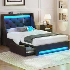 Twin Bed Frame with LED Lights and Charging Station (Color: Black, size: Twin)