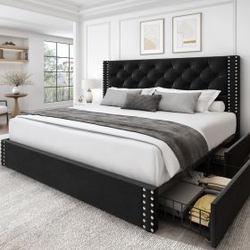 Queen Size Upholstered Bed Frame with Storage (Color: Velvet Black, size: King)