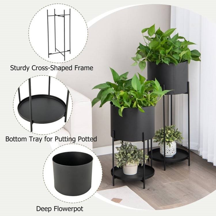 This Set of 2 Black Metal Garden Planter Pot with Storage Shelf is constructed of high-strength sprayed metal ensuring long service life. The flowerpot set includes 2 planter pot stands of different sizes, which are suitable for displaying plants in different sizes. This plant stand with pot is quite easy to set up, and all you need to do is unfold the stand and lock it with the fixing snap, then put the flowerpot and tray on, which would finish in seconds. And the installation process requires no tools.