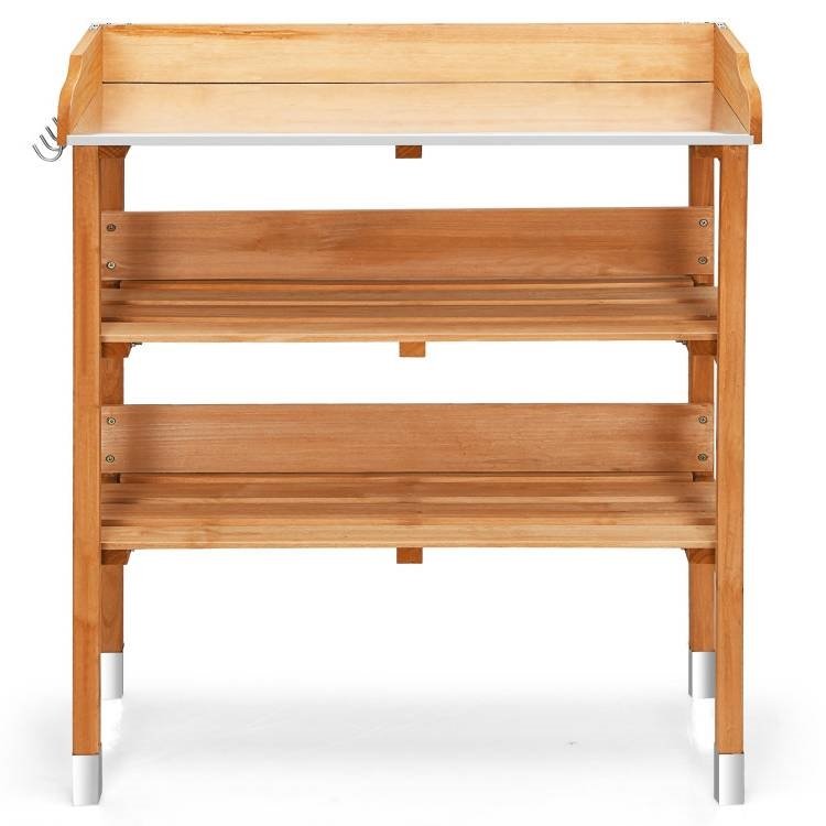 This Solid Wood Outdoor Garden Bench Table with Bottom Storage Shelves and Metal Top can be an ideal tool for garden job, they can put in small patios, decks, condos and apartments. Made of solid wood and metal sheet, the work station is durable and sturdy. With a hook, the work station can hang garden tools. The three shelves are provided for storing potting tools, seeds and other tools. The feet of the work station are covered by galvanization, protecting the feet from rotten. This work station can satisfy your garden potting job, do not hesitate to buy one.