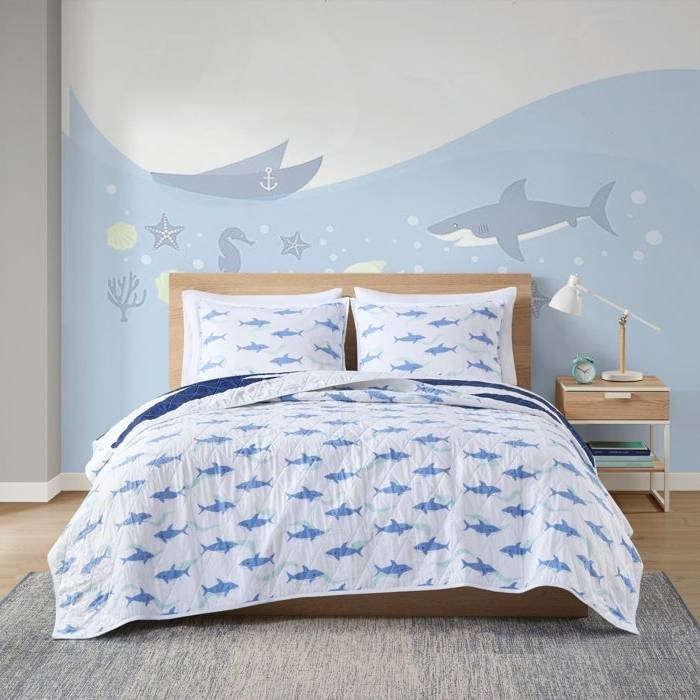 This Twin Size 2 Piece Coastal Reversible Navy/White Sharks Cotton Quilt Set adds a bright, playful accent to any bedroom with its colorful two-tone navy/white stripe pattern on one side and a bold print on the reverse. It includes a quilt with a noticeable diamond weave along with two coordinating shams (one for the twin coverlet option). Each item is made from a breathable cotton fabric that arrives pre-shrunk and is good for all seasons. This set is non-pilling, so it stands up to frequent use and multiple trips through the washing machine.